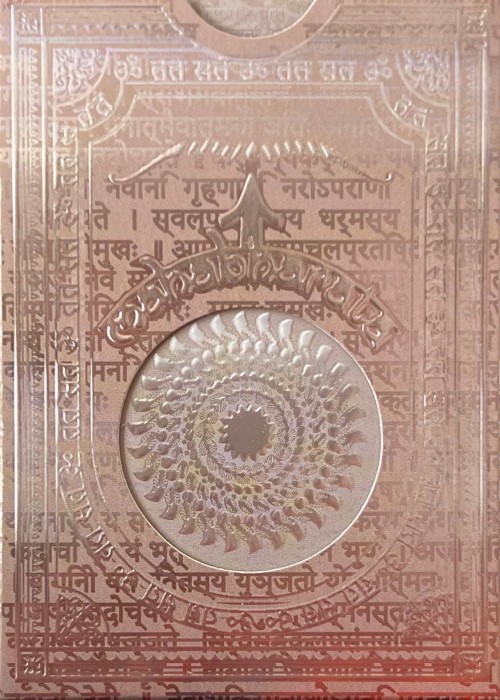 The tuck is a special two-part tuck where the outer sleeve is die-cut, foiled, printed and then embossed. The inner sleeve, housing the playing cards, is produced using the same method. The Sudarshana Chakra, the central element of the tuck's two-part front design, is a divine discus wielded by Lord Krishna, an incarnation of Vishnu. It is depicted as a spinning, serrated weapon with sharp edges, symbolising divine protection, righteousness, and cosmic order. The surrounding text is "ओम् तत् सत्" or "Om Tat Sat", which represents the unmanifest and absolute reality. This key concept is expounded in great detail in the Bhagavad Gita (a part of the Mahabharata). The inner sleeve (as well as the outer sleeve) features a grand foil-textured design with the most famous passages from the Bhagavad Gita. The sides hold the title Mahabharata (महाभारत) in Sanskrit, and the seven chakras, which, as per yogic teachings, are energy centres in the human body that influence physical, emotional, and spiritual well-being. The beautiful tuck-back is ornate, featuring a foiled painting in the traditional Indian miniature style, which portrays Lord Krishna expounding the Bhagavad Gita (one of the holiest texts of the Hindus and part of the Mahabharata) to Arjuna, his greatest devotee and friend, amidst the Battle of Kurukshetra.