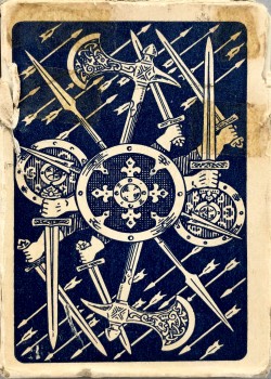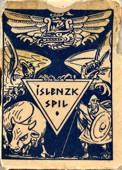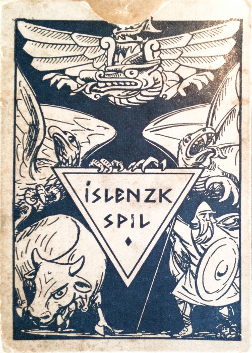 This historical Icelandic deck was first published in c.1930 and shows the native Icelandic Vikings of some thousand years ago with stern expressions but rendered in a romantic naturalistic style. Their names are given in Icelandic lettering in the ornament separating each end of the design, which also includes Viking motifs.