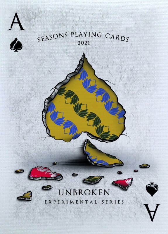 The rare UNBROKEN series was launched by Seasons Playing Cards in a unique mystery deck sale. This was an experimental launch based around the premise that each deck would be unique in its own way. Only 250 “experiments” were produced in this extremely labor intensive project. Each piece is signified by a holographic seal featuring the Seasons logo featuring an ‘X’ indicating the eXperimental series along with a ‘1 of 1’.