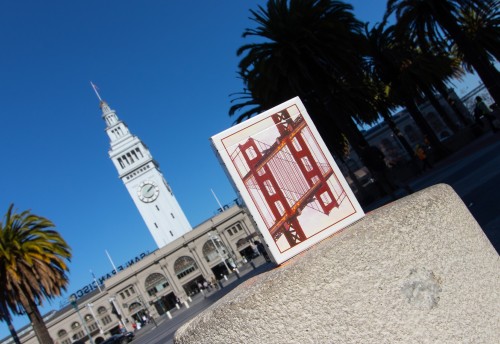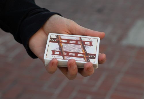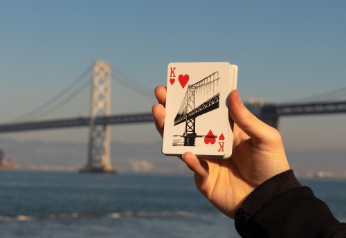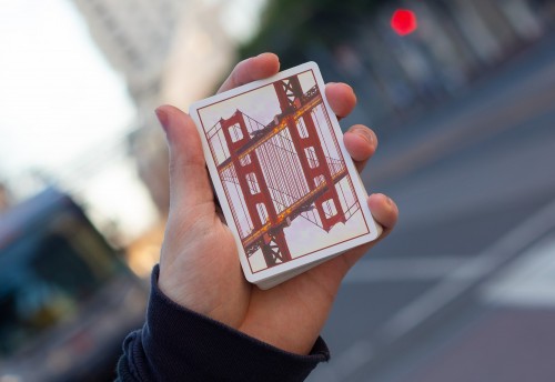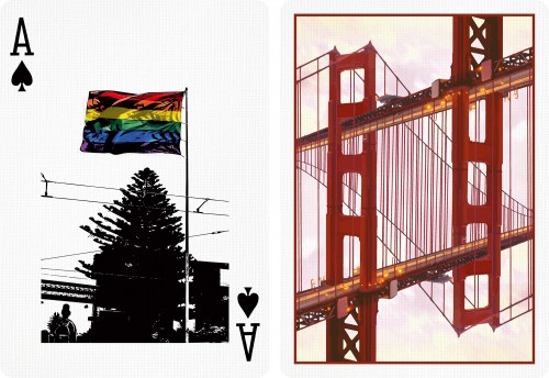 Gate Playing Cards features iconic landmarks of San Fransisco in Black and White illustrations on Courts and Aces. The deck prominently features the famous Golden Gate Bridge.