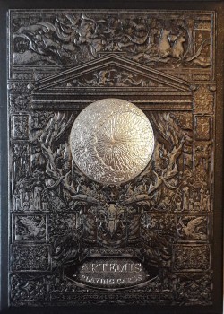 Red colored poker size playing cards with the letter “A” on top of the deck. Image below has an icon that has a Diamond within a Club within a Heart within a Spade suit surrounded by flowers.