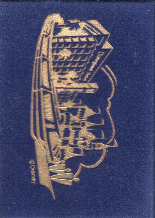 (Disneyland, 1960s) Deck of Disneyland Hotel playing cards in blue velvet box. Features gold-colored imagery of the hotel and monorail on the cover of the box and backs of the cards.