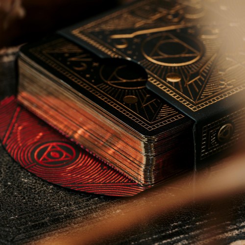 Devotion Gold was the main 2022 TWI Patreon reward. Features: Courts of this deck cannot be shared! Courts and pips are 100% new and custom, not standard or standard-ish. Luxury tuckbox: gold foil (outside) and red foil (inside) on black premium matte paper Embossing on box Gold gilding on cards Gold hot foil on card backs Metallic inks on card faces