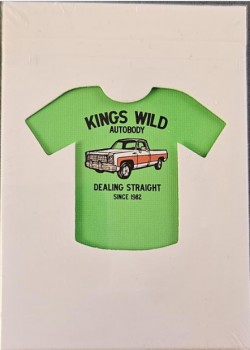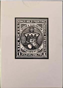 "The Newest Kings Wild Threads Deck features the Ace of Spades from the Crow Brand deck. These limited print decks feature a matching two-way pattern on the back design and an extra card with the Ace of Spade which can be viewed through the custom shirt shaped die cut hole on the tuck case. Designer Jackson Robinson used his own standard court and pip designs on this simple yet unique deck of playing cards."