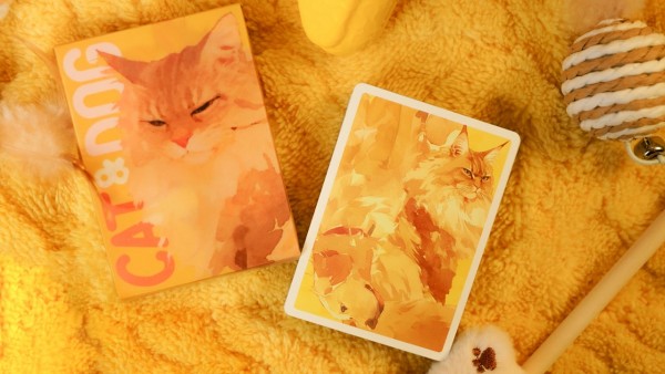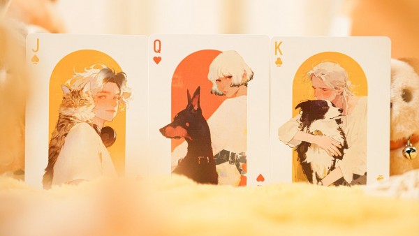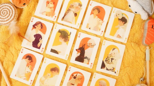 We designed this deck of cards with warm tones, featuring these heartwarming "fur babies" that heal our hearts and bring us joy, relaxation, and warmth. In the design of the deck, we continued with warm tones, featuring the good-natured Maine Coon and Golden Retriever on the card backs. The bright orange and yellow on the card faces replace the traditional red and black suits. We've hidden a little sweetheart in the pip cards! The court cards depict charming scenes of joyful moments shared with pets. An excellent deck for lovers of pets, especially cats and dogs.
