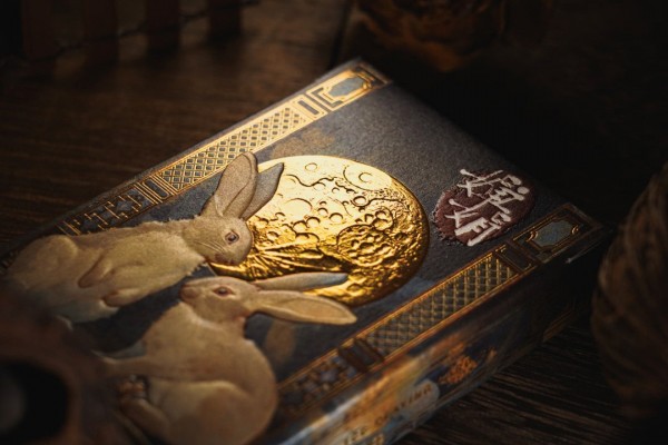 The tuck box features embossed gold foil craftsmanship, beautifully capturing the two clever and lively jade rabbits, gracefully leaping under the moon. Against the deepening night sky, lush golden osmanthus trees, Chinese-style border patterns, and a special Mid-Autumn seal combine to create essential symbols of Mid-Autumn culture.