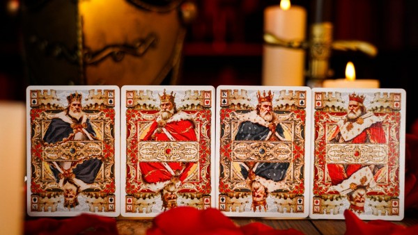 We present a classic, elegant design with embossed knights and castles on the tuck case, adorned with red foil extending to the interior. The suit designs, inspired by heraldry and embellished with gemstones, reflect the grandeur of royalty. The deck gives you the feel of royalty, travel back to medieval times when kings and queens reign, and soldiers walk around with their grand armors.