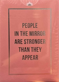 Ponder features pastel pink color scheme for the tuck box and red suit cards. The cards are gilded with silver foil.