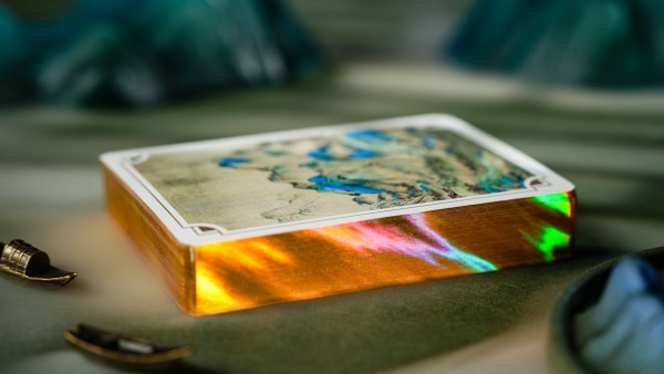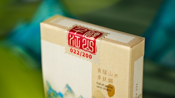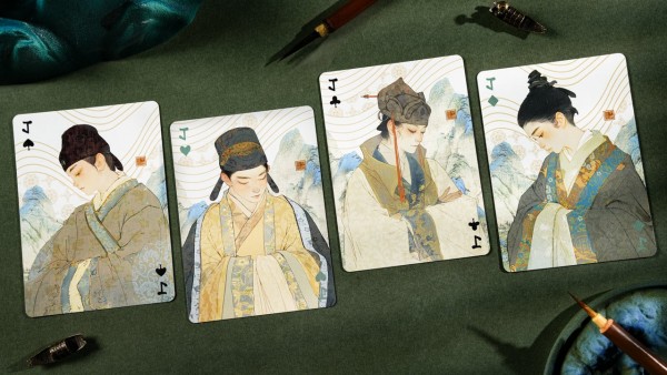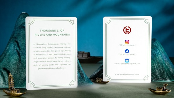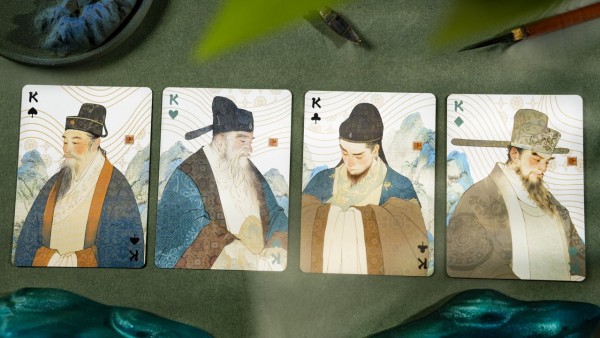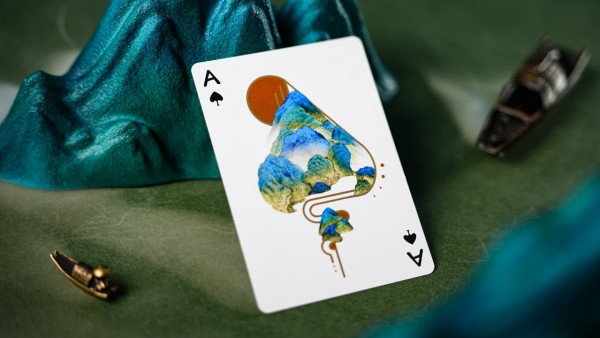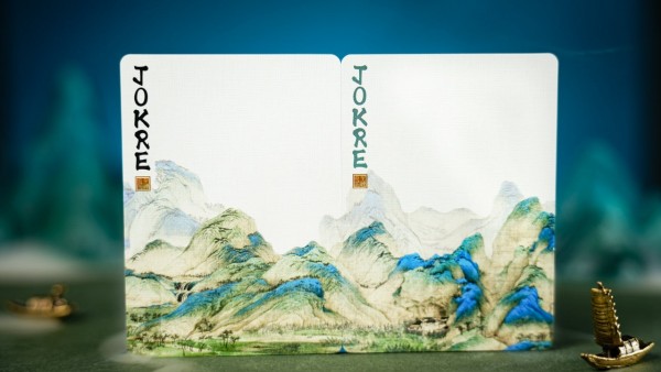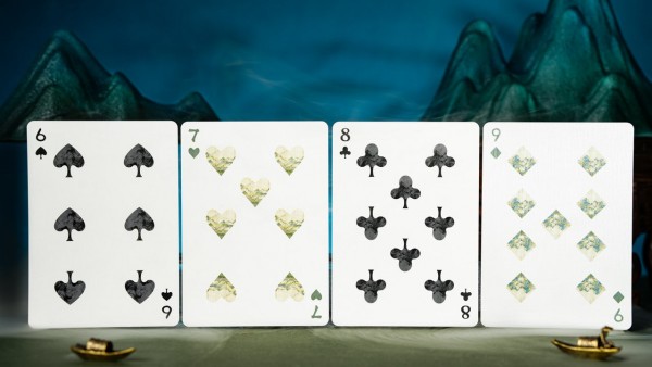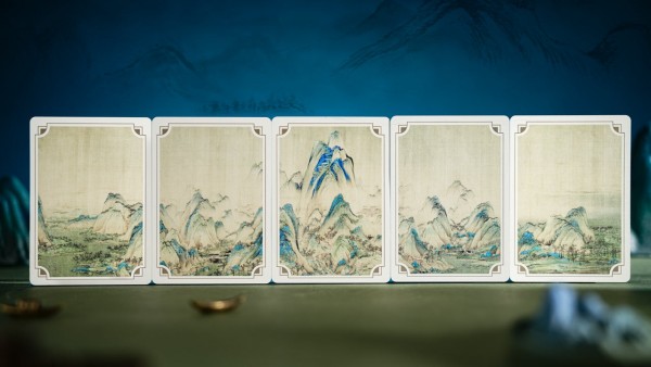When arranged in sequence, the card backs of each suit come together to form a complete landscape [using 28 cards, either from two ad cards with Spades and Hearts cards OR Clubs and Diamonds cards with two Jokers]. Subtle creases and marks on the backs echo the painting’s centuries-old journey, evoking a uniquely rich and timeless atmosphere. The custom pips feature small portions of the mountain drawings inside. The Courts feature half-bust illustration of Chinese kingdom royalties.