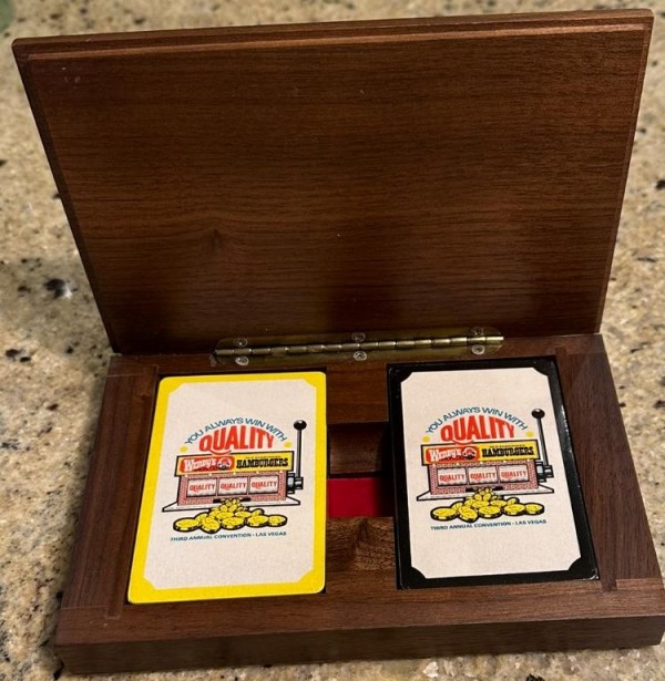 Hard to find any concrete information on this deck/set. Deck/set was given out during the Wendy's third annual convention in Las Vegas. Includes 2 decks (one black, one yellow) in a 'fancy' wooden box. Box is lined with red felt and has a color metal plaque on the front (see additional pictures for photo of the box). From what I can find out, the first annual Wendy's convention occurred in May 1976 in Atlanta, GA. If the timeline holds true, the date on this set would be in 1978.