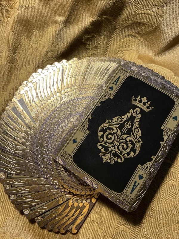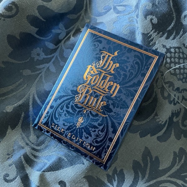 GOLDEN RULE Silk Edition is the second edition of the Golden Rule deck. All decks are hand numbered, they have a GORGEOUS blue foil background with the Silk pattern on the tuck case which contrasts beautifully with the gold foil letters. The front side has gold foil and the back side has blue and gold foils.