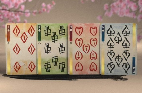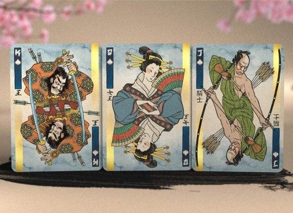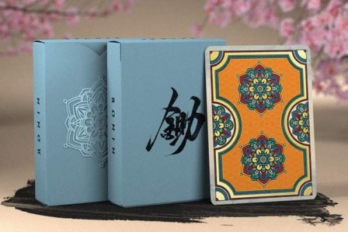 The Aces feature samurai helmets adorned with metal accessories that has the shape of respective card suit. The back ground of each cards suit are colored respectively. The indices has Japanese characters of the number and ranks. The Number Cards feature custom pips: suit drawn using traditional brush strokes. The Courts feature two-way illustrations of Japanese warriors jacks, geisha queens, and samurai kings. The Jokers feature identical illustration of demon masks, colored red and blue respectively. The extra two cards form "Ronin" in stylized Japanese characters. For the artworks, on every metallic details (such as the weapons or armour metal ornaments) along with the golden strips on every card are finished with gold cold foiling.