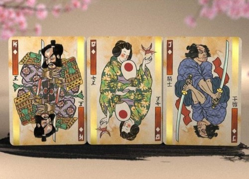 The Aces feature samurai helmets adorned with metal accessories that has the shape of respective card suit. The back ground of each cards suit are colored respectively. The indices has Japanese characters of the number and ranks. The Number Cards feature custom pips: suit drawn using traditional brush strokes. The Courts feature two-way illustrations of Japanese warriors jacks, geisha queens, and samurai kings. The Jokers feature identical illustration of demon masks, colored red and blue respectively. The extra two cards form "Ronin" in stylized Japanese characters. For the artworks, on every metallic details (such as the weapons or armour metal ornaments) along with the golden strips on every card are finished with gold cold foiling.