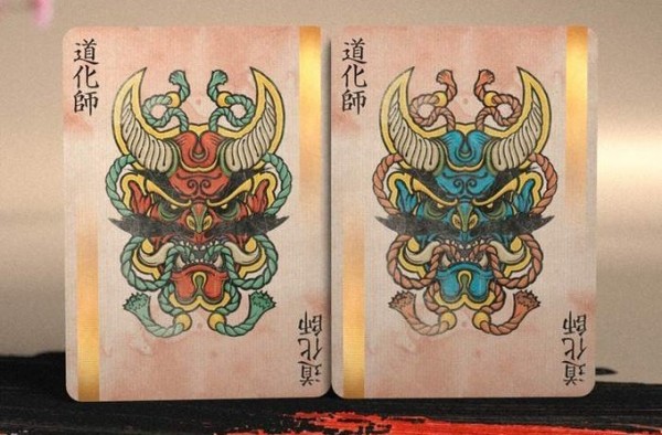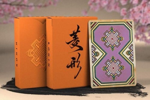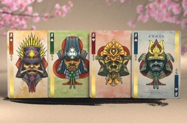 The Aces feature samurai helmets adorned with metal accessories that has the shape of respective card suit. The back ground of each cards suit are colored respectively. The indices has Japanese characters of the number and ranks. The Number Cards feature custom pips: suit drawn using traditional brush strokes. The Courts feature two-way illustrations of Japanese warriors jacks, geisha queens, and samurai kings. The Jokers feature identical illustration of demon masks, colored red and blue respectively. The extra two cards form "Ronin" in stylized Japanese characters. For the artworks, on every metallic details (such as the weapons or armour metal ornaments) along with the golden strips on every card are finished with gold cold foiling.