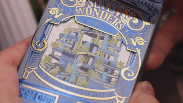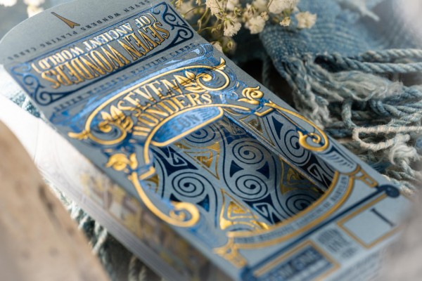 The allure of the Seven Wonders is captured in the Die-cut Window Tuck Box, a centerpiece of this release. A window is punched out of the embossed and hot-foiled tuck box, allowing us to peer into days past, where the Hanging Gardens of Babylon takes center stage as our 55th custom face card.