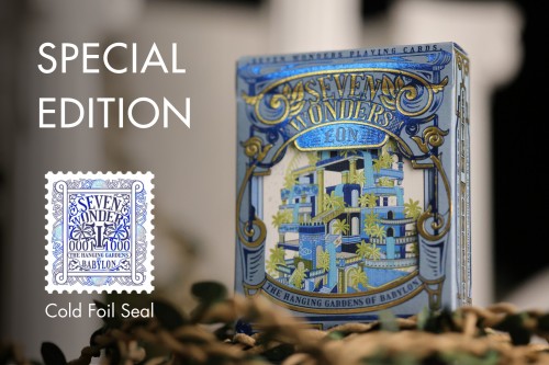 The allure of the Seven Wonders is captured in the Die-cut Window Tuck Box, a centerpiece of this release. A window is punched out of the embossed and hot-foiled tuck box, allowing us to peer into days past, where the Hanging Gardens of Babylon takes center stage as our 55th custom face card.