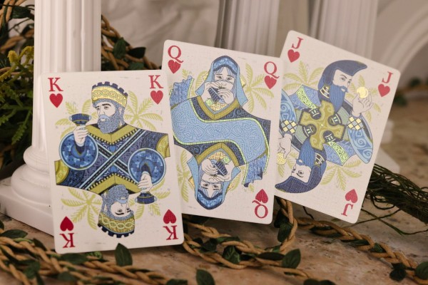 A medley of Babylonian nobility is rendered in their own two-way court illustrations, backed by subtle and intricate detailing that enhance each card's dimensionality.