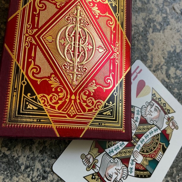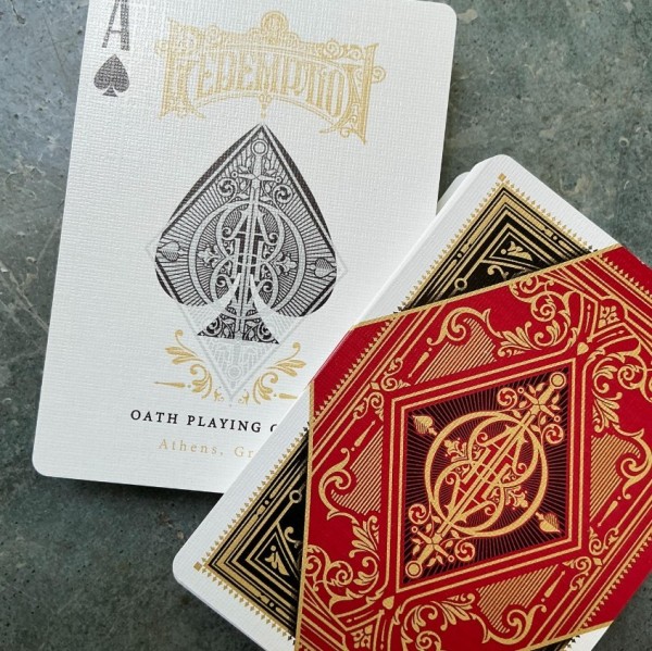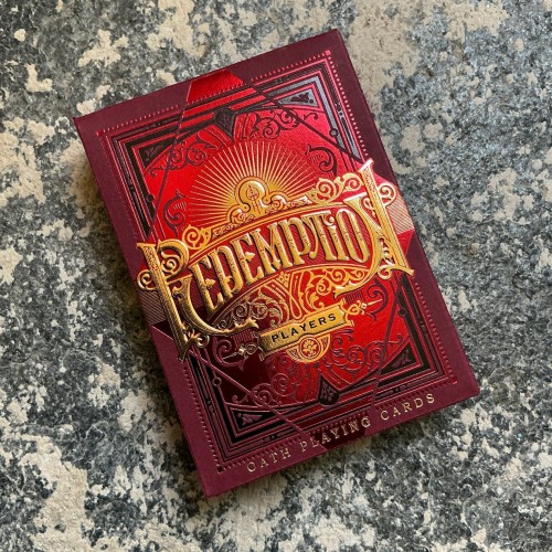 Redemption Players Playing Cards is a classic standard yet custom deck of cards designed by Lotrek. It is inspired from "REDEMPTION STORIES"; Patreon exclusive deck series only available to Oath Playing Cards patrons - notice how the broken border back design is a diamond shape which is a reference to the die-cut window of the deck series deck sleeve. The cards printed using CMYK plus gold and silver metallic inks. Featuring my latest take on the standard courts, the decks are visually special and classy, while still very player-friendly. The tuck box is made of matte stock with embossing and three different metallic foil.