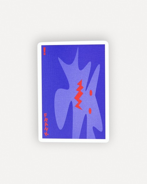 The Monster-esque back design by Komorebi. This one features purple and red, with landscape oriented back as well as landscape oriented indices. The Courts feature graphic abstract art of monsters.