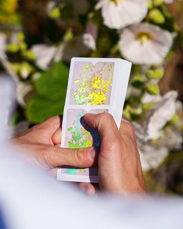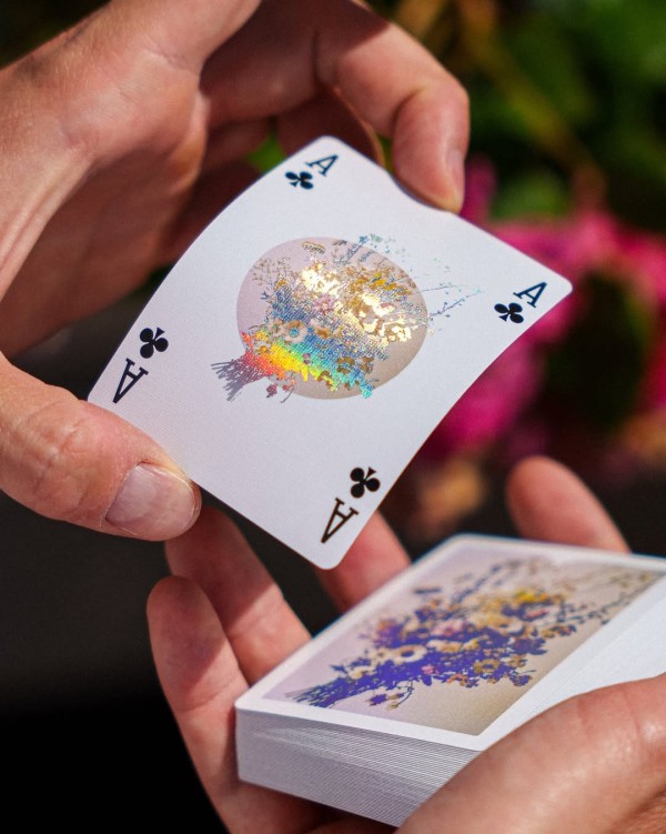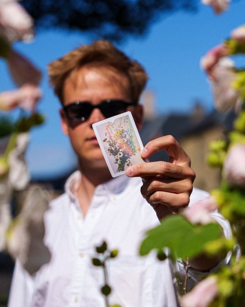 For the first time in the Sepal series, the full bouquet is brought to light and transformed by holographic foil. Designed with subdued contrast in mind, even the smallest movements unlock unique color gradients. Every reflection is a new interpretation of the design.