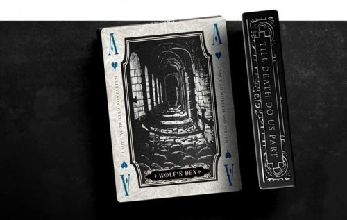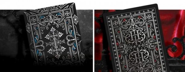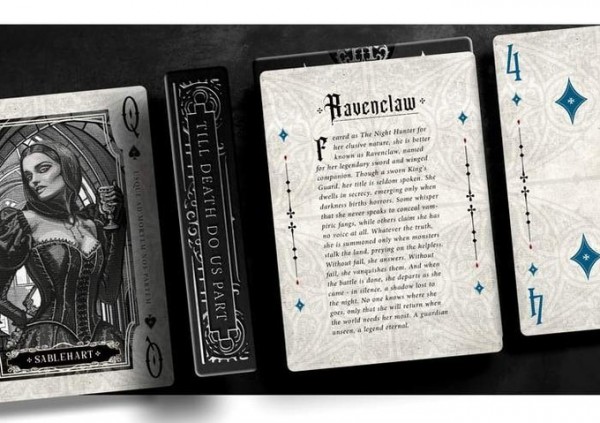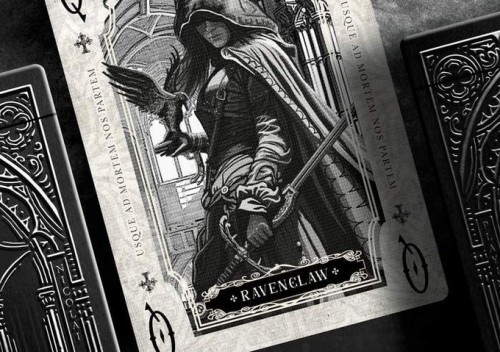 Ravenclaw features tuck with gothic ornamentation, taking inspiration from gothic portals of mausoleums and Victorian tomb stones, while featuring an iconic raven. It is manufactured with black and silver foil, strategically embossed on a matte, black stock. The red cards color is swapped to blue, and the cards have silver foil gilding.