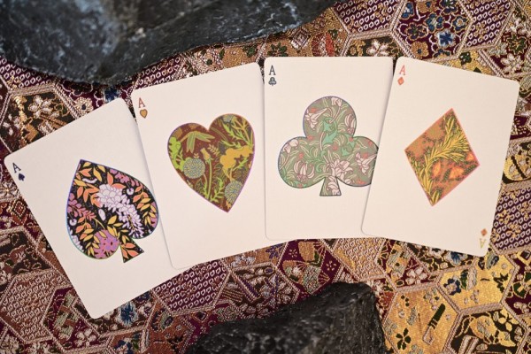 This Patreon 250 Edition is very exclusive to the patrons of Jack Brutus Penny Patreon - The sleeve is silver metallic foil with red embossed artwork and the pattern featured is wisterias & silkworms. The cards are gilded with silver metallic foil - the deck is that of Dyed Patternwork variant; dual-pattern back of lilies & ladybirds in blue/turquoise/white with thymes & tiger beetles in red/green, silver holographic cold foil faces