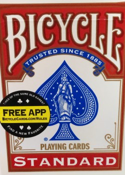 Standard Bicycle deck in red, 140 Years tuck seal. Released in 2025, copyright of deck is 2021.