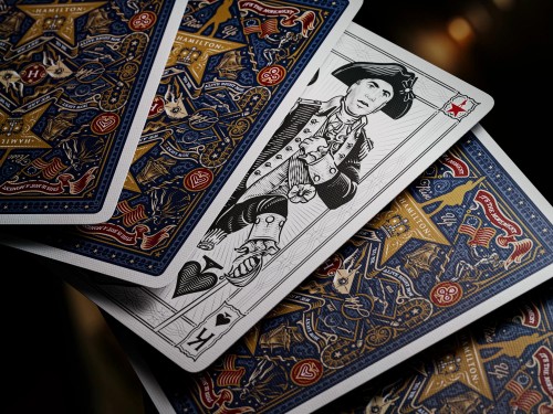 Premium playing cards celebrating the 10th Anniversary of the iconic American Musical! Hamilton is one of the most successful Broadway productions of all time. Put history in the palm of your hands with illustrations that are rich with hidden references and lyrical nods that only true fans will catch. Featuring gold foil accents and precise embossing, they are approved for play by royal decree!