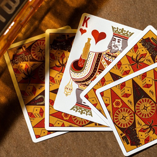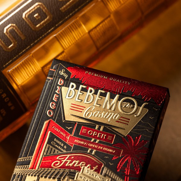 A deck of premium playing cards produced in collaboration with Bebemos, a tequila brand based in San Diego, California. Featuring tuck box with gold foil, red foil, and champagne foil accents - with a vintage feel and elegant, upscale, refined aesthetic. The back design features backgammon style artwork with roulettes lineup and horseshoes, with the casino signage on the corners, and small elements are gold foiled. The Courts are adapted from JAQK.