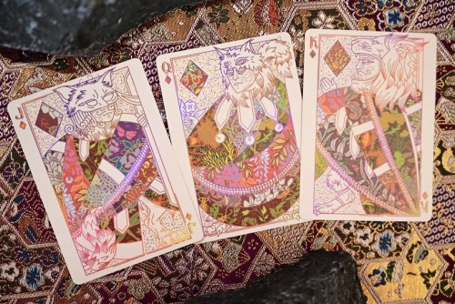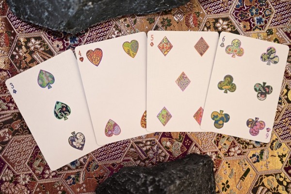 Patternwork Playing Cards is an exploration of Japanese patterns fused with English style tapestry. The tuck box is composed of two parts: the fully foiled sleeve with extreme precision laser cut holes pattern and the fully covered patterned box. The cards are gilded with metallic foil with the back design of full-bleed borderless pattern. Most of the artworks on the deck appears as outlines, with patterns are the main focus of the deck.