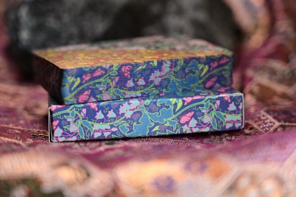 This is one of the Dyed Variant; Dyed Patternwork have dual-pattern back of lilies & ladybirds in blue/turquoise/white with thymes & tiger beetles in red/green, silver holographic cold foil faces with unique dyed edge printing that matches the tuck box artwork. - The sleeve is turquoise metallic foil with pink embossed artwork and the pattern featured is bluebells & butterflies. The cards are edge printed with the pattern of the box, with a single butterfly on top side.