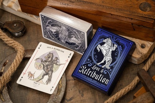 Love & Retribution Part 2 Playing Cards - Gilded Edition in deep shades of navy blue with classic styling throughout and a fully foiled, specialty paper tuck with silver and blue foil elements - featuring shimmering silver gilded edges throughout (gilt edge). This deck is inspired by the second half of our Love & Retribution story, set in Victorian England, in which Sarah and Henry meet and fall in love against all odds and to the disapproval and contempt of Sarah's father, landowner George Fairhurst. The deck is illustrated throughout with painstaking hand-drawn characters and details and features fully custom artwork and design elements at every turn, while maintaining the roots of a classic deck of playing cards every bit as functional as it is pleasant on the eye.