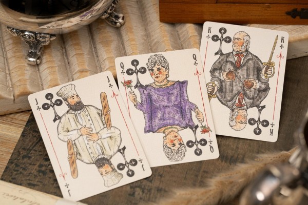 The Jokers in each deck tell a story. When placed side-by-side, the Jokers from each deck form a diptych depicting a scene from the book.
