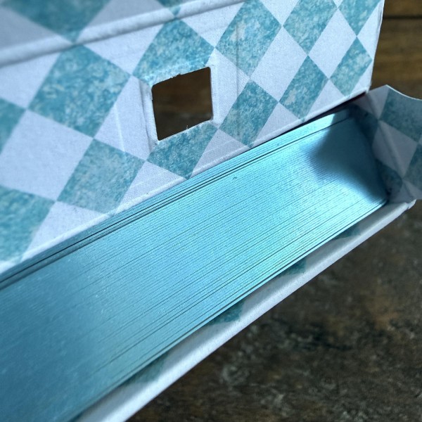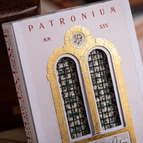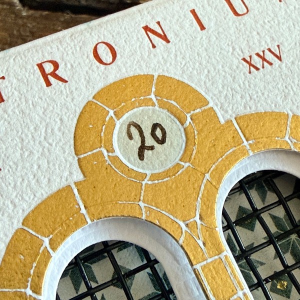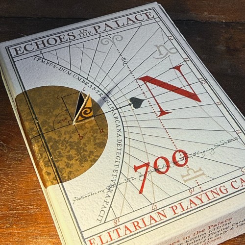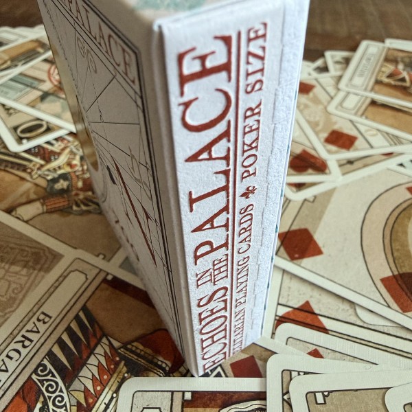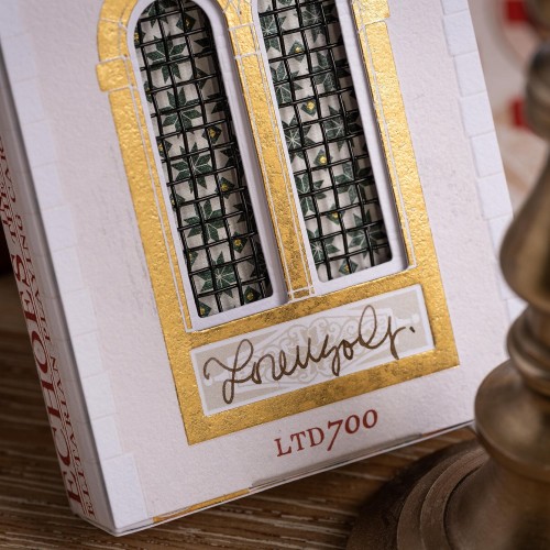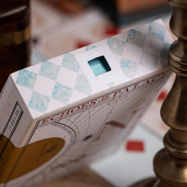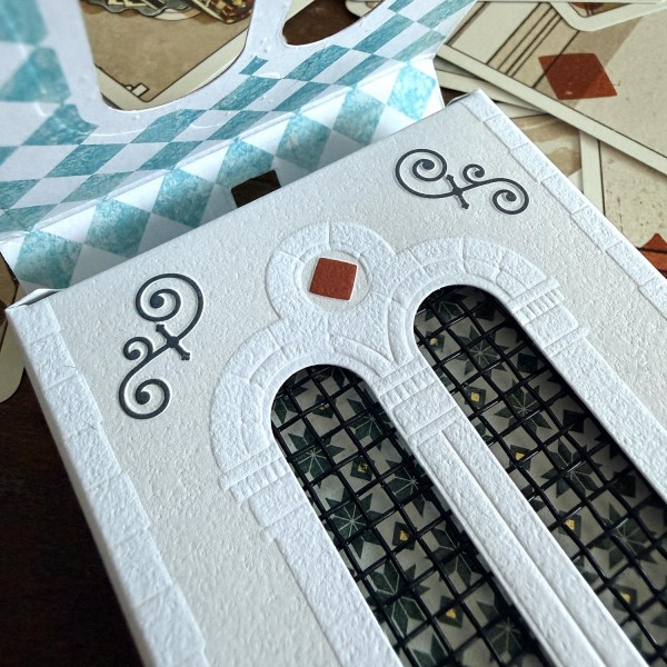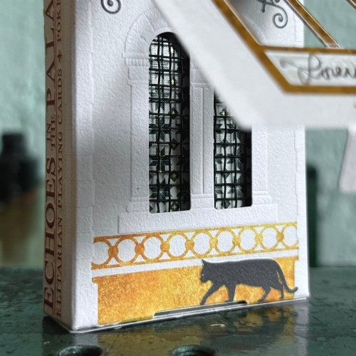 The tuckboxes feature progressive number and signature with fountain pen, numbered and signed with care one by one. It is a box with a full-length flap with embossed and foiled artworks, and it is designed to integrate parts of the palace onto the box. The back side of the box is thick, as it is designed to show an actual metal-grated window - embossed bricked walls and window frame with die-cut holes and REAL black metal wire mesh along with gold foil decoration pattern with a strolling black cat. The full length flap mirrors the window, with the framework done in gold and there are spaces for the hand numbering (on the small circle) and signature (bottom side of the window). Also, the top of the flap has a small square die-cut hole which is to view the gilding of the cards - the deck is gilded with turquoise foil. The front side of the box, which extends to the right side, is a miniature sundial - complete with a small pop-up triangle. The interior of the box has an extra backdrop featuring Latin inscription, and you can see them through the grated windows when the cards are out of the box.