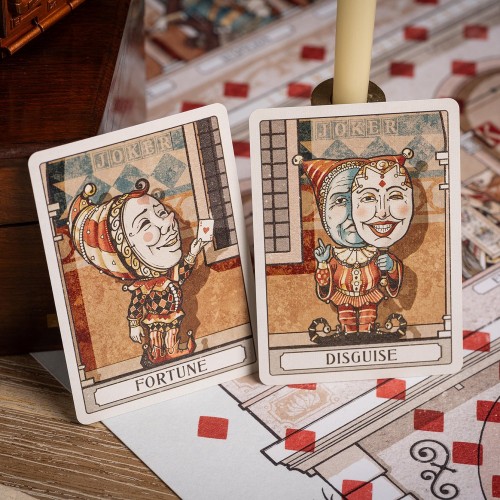 Designed for both play and divination, the deck unfolds a silent story of deception, desire, ambition, and judgment—enhanced by four special Jokers representing the forces of fate: Madness, Fortune, Misfortune, and Disguise.
