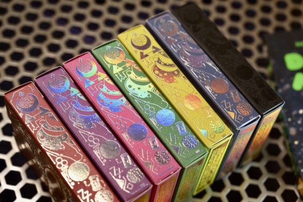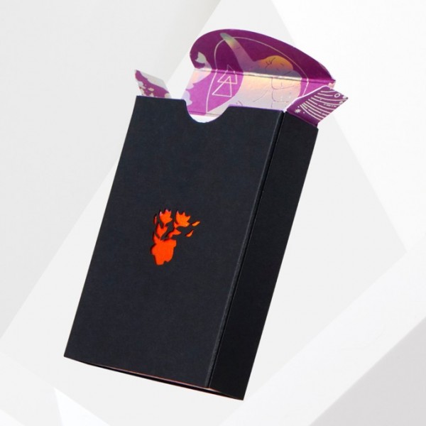 The tuck box is a double-layer construct. The sleeve is a black matte stock with a precision laser-cut graphic of the catchphrase "DON'T PANIC" on the front and an related item of the story on the back. There are 6 different variants, based on the color of the box as well as the icon on the back of the sleeve. The main box is made of matte stock with two different holographic hot foil (mainly silver, with gold on the spaceship and some small details). The interior of the box has a graphic art done in holographic foil.
