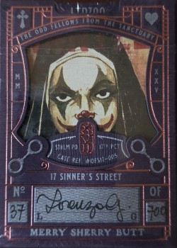 Merry Sherry Butt Signature LTD features plum color scheme of the back design. The cards are gilded with copper foil. The tuck box features dark purple matte stock with embossing and copper foil - the back side features a large die-cut window showing the mugshot of the character with a section for hand-numbering and signature. The deck comes with a fake imitation hip flask which is to hide the deck inside - made of stainless steel with aged copper finish.