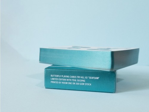 The Seafoam Variant has the matte fully-foiled box in seafoam foil with white matte spot foil for the circle and the butterflies. The cards are gilded in seafoam foil. The deck is bundled together in a 3-deck set inside a sealed acrylic case.