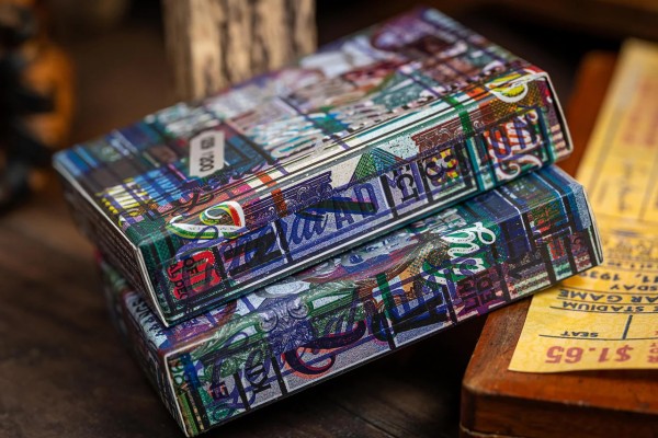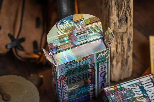 The Gilded Edition features tuck box with chaotic artwork - as if they are collages of tickets. The cards are gilded with holographic foil. Only 200 decks are made.