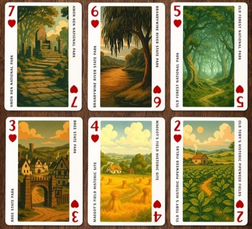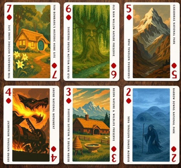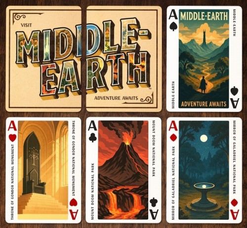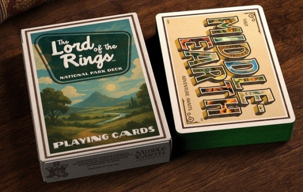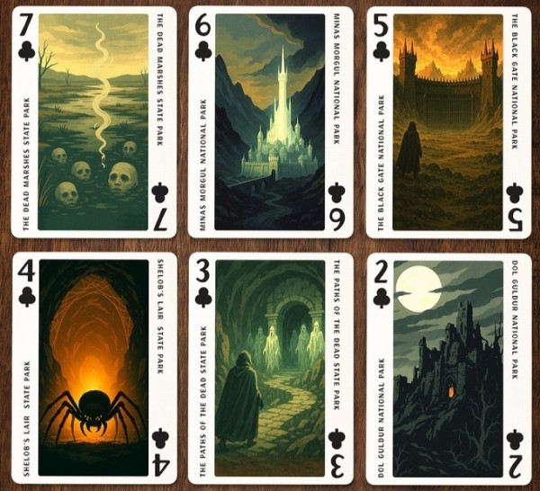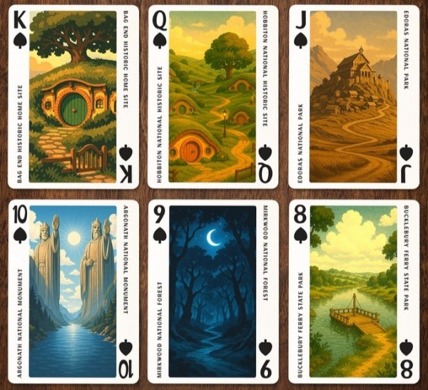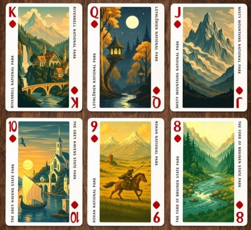 As a companion to the exclusive Middle-Earth licensed Jigsaw Puzzle, Jackson Robinson presents the Lord of the Rings National Park Playing Cards. All 52 cards feature "Park Poster" style art of Middle Earth locations - full-length illustrations along with the name on the corners. The artworks are generated using AI - the creator had announced transparency regarding usage of AI as well as permissions to use the artworks. The Jokers are a diptych illustration of vintage park promotional billboard - 3D letters of "Middle-Earth" with selected scenes inside each letters.