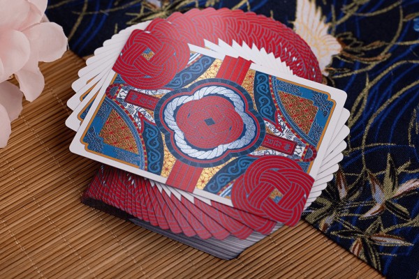 The card back design is a masterful fusion of two potent motifs: the sacred shimenawa rope, representing the binding connection of en (fate), and the protective form of the omamori knot (御守結び), symbolizing the blessing and guidance offered by the divine. This hybrid design creates a "Knot of Fate" centered on each card, flanked by two omamori knots from the corners of the cards. When fanned or flipped, the deck performs its own magic. The intricate corner omamori knots appear to spin and whirl to life. This creates the mesmerizing illusion of an endless sacred bond connecting all. It brings to life the very essence of the Month of the Gods, where every shuffle becomes a ritual, and every deal is guided by the threads of divine connection.
