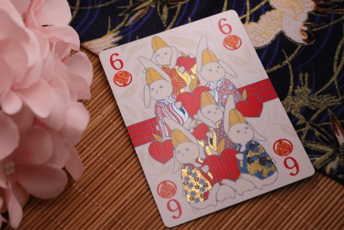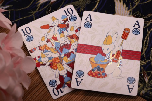 These Number Cards capture the joyous assembly of hares as they herald the coming of the gods. Each card features a unique hare, celebrated in a moment of reverent anticipation. The number cards feature a transformation deck, where the pips elegantly evolve into rabbits. When fanned or laid in sequence, the cards reveal their true magic: Straight bars representing the strands of fate run through each card, connecting to form an endless, unbroken panorama, a visual testament to the divine bonds of en. This continuous connection can be fully appreciated when displayed as a beautiful uncut sheet.