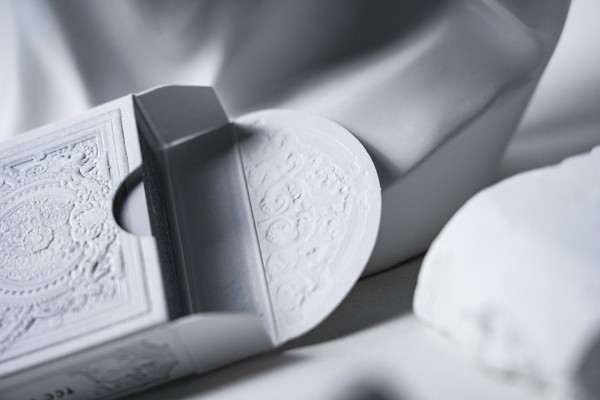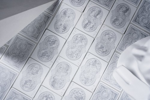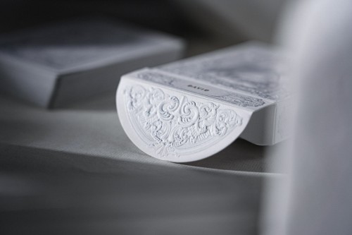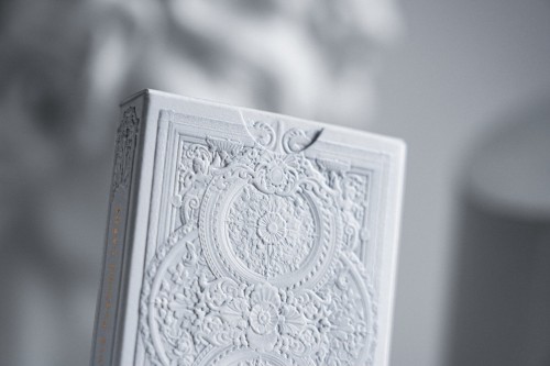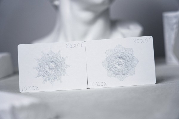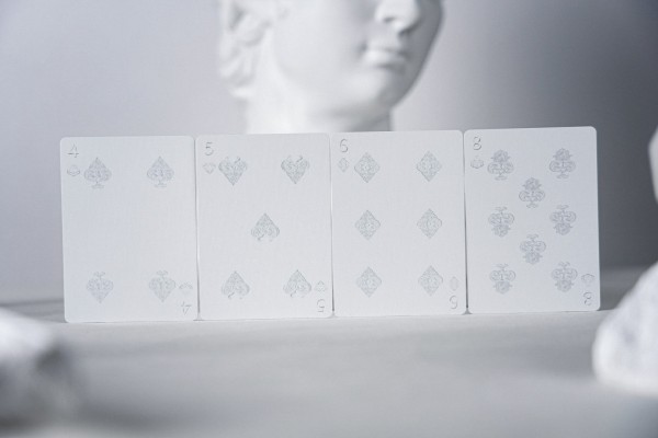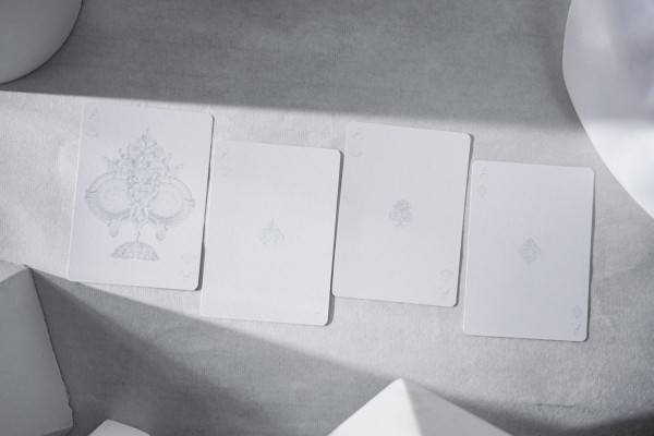 The cards maintain the theme of pure elegance, with unified colors across all suits. During the printing process, eye-catching premium PANTONE silver ink was employed, elevating the deck's luxury and further accentuating the theme.