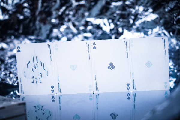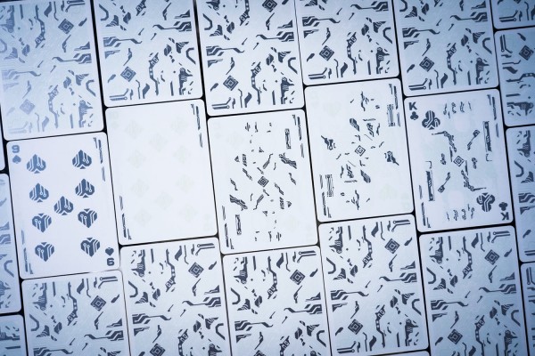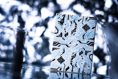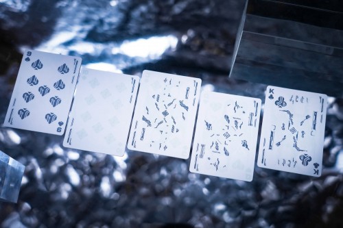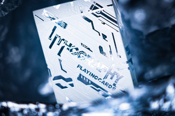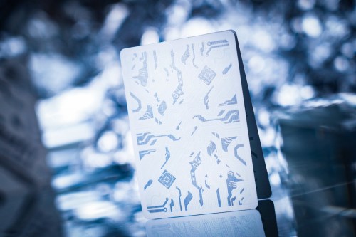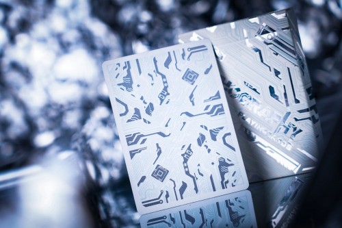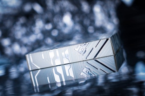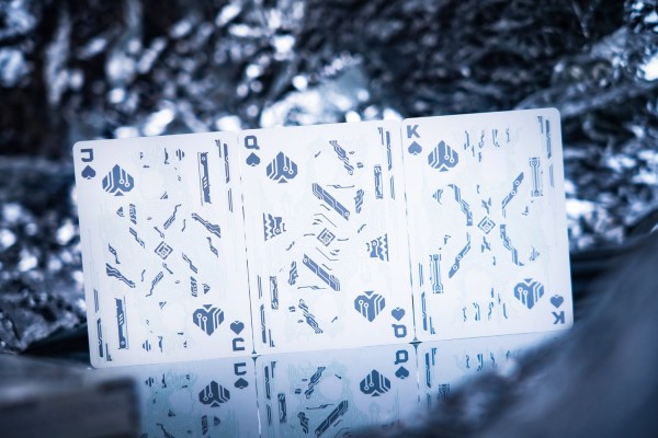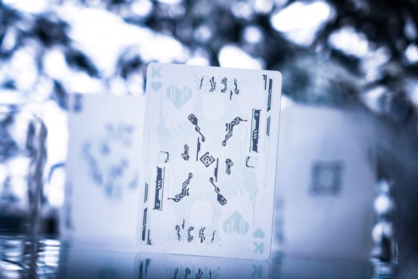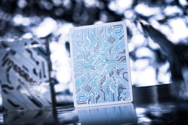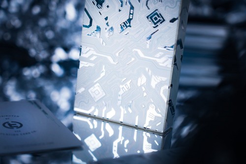 The cards also embody the changes under illumination. With clean and sharp lines, they underwent a redesign inspired by circuitry style. Not only the circuitry pattern on the card backs, but also all the hearts and diamonds flourish with the support of UV color-changing ink.