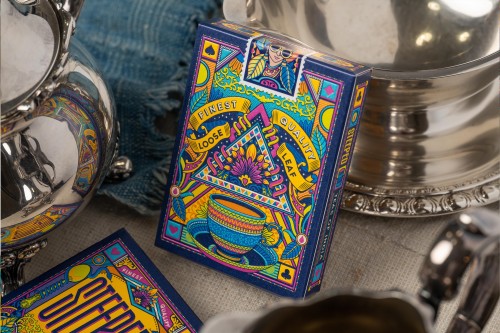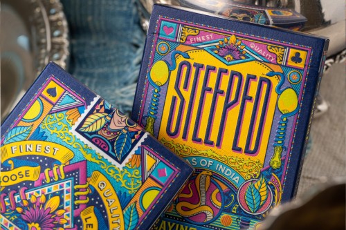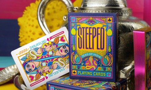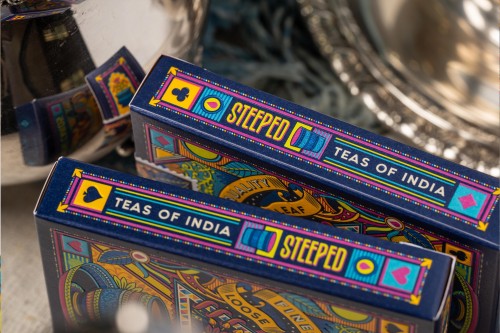 STEEPED (Teas of India) playing cards, the deck that enters the world of the Indian Chai Wallah. Designed using the Indian maximalist style, bold and vibrant, but also reminiscent of an elegant box of tea leaves. Neon colours contrast with the traditional style of engraved silverware to make this deck pop. printed using Viper Finish with a luxurious embossed, pearlescent Tuck Box.