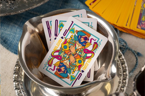 The court cards of each suit are represented with a different regional tea blend. The Spades tea house serves Nilgiri, the Hearts serve Darjeeling, Clubs serve an Assam blend, and the Diamonds tea house serves a Kangra tea. The royals of each teahouse have matching ceremonial robes and are adorned with ornate teapots, spoons, coiled snakes and steaming cups of chai.
