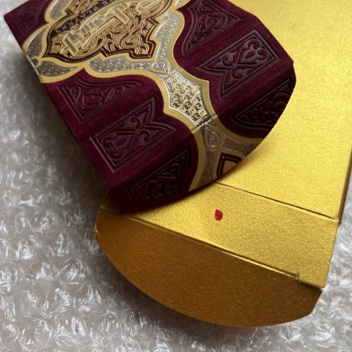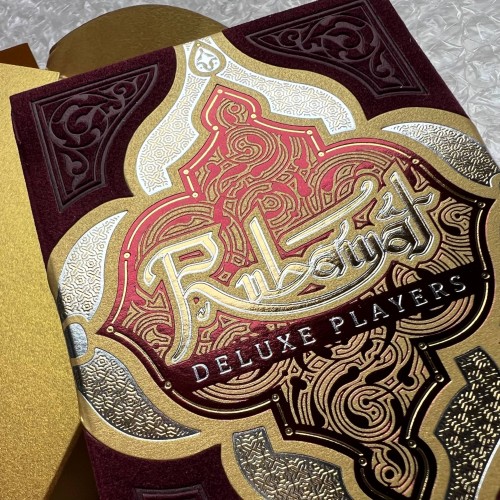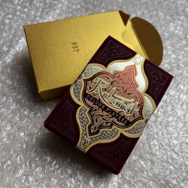 DELUXE PLAYERS features tuck box with velvet material with a combination of silver and gold hot foil stamping and deep debossing of the pattern. The bottom side of the box is hand-numbered. Every Deluxe Player deck comes with an extra gold box as a protection - the colored dot on the top of it tells what color is the deck inside and the stamped number on the back tells the numbering of the deck.
