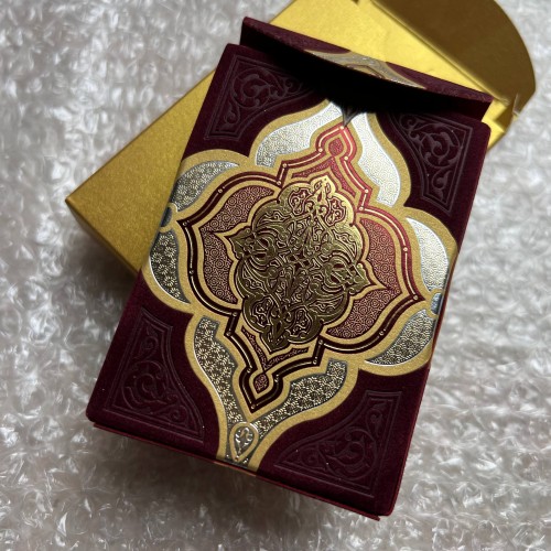 The Players Edition features the deck printed with 2 metallic inks (gold and silver) over CMYK printing. The artworks feature intricate Persian patterns, almost looked like vintage carpet with painstaking details on the borders. The broken border elements on all four sides create a very beautiful visual when the cards are fanned. The Courts feature people in Persian kingdom costumes. The Jokers feature the majestic peacock. Each deck features a double-backer and dual red/blue back card.