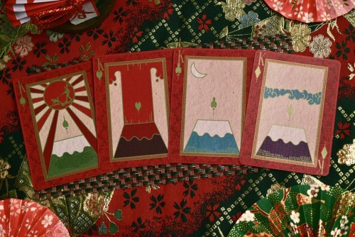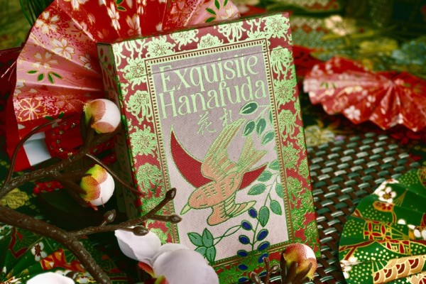 Exquisite Hanafuda Playing Cards is a fusion between the classic standard French playing cards with Japanese regional picture playing cards called Hanafuda. The fusion results in beautiful playing cards displaying Hanafuda illustrations combined with standard playing cards indices. The tuck box features matte textured paper with foiled pattern on the exterior and interior side of the box, with the front side showing the deck's title. The back design is a full-bleed borderless flower pattern. The faces of the cards feature metallic cold foil, with the edges are gilded with metallic foil as well.