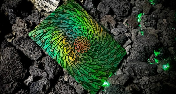 Inspired by Greek Mythology, the Medusa Deck has a mesmerizing Back design of green and orange snakes. Printed by Legends Playing Card Co., the Cards are printed on a Holographic Foil material (Faces and Backs)! Continuing the Legends tradition of constant experimentation and innovation, the Card edges feature ULTRA GREEN, which is an all-new dyed light green paper for playing cards. ULTRA GREEN does not chip, and the deck will look and feel new for much longer.